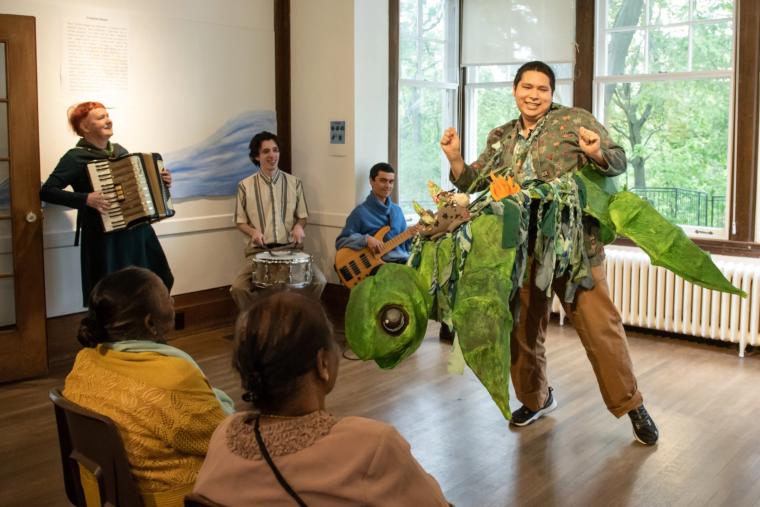 Our artwork is often performance-based, and we collaborate across disciplines and traditions, particularly exploring intersections of performance and design. We draw on theatre, puppetry, projection and shadow play, installation (indoors and out) music, dance, culinary and textile arts, and film.